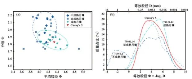 此外,对嫦娥五号月球样品特性的研究指出,“使用光学显微镜,对155 Mg嫦娥五号月壤颗粒显微光学成像,统计数据显示,月壤颗粒95%的直径分布在1.40~9.35之间。μm(均值3.96 μm),粒径分布在4.84~432.27中,占总质量的95%。μm(均值49.80μm)。"粒度和分选与阿波罗和月球号月壤样品的变化范围一致。