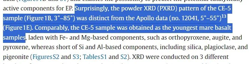 原文说:“令人惊讶的是,嫦娥五号的粉末X射线衍射(PXRD)图案与阿波罗数据(编号12041)大不相同。” 研究小组表示:相比之下,嫦娥五号样品是月海玄武岩最年轻的样品,富含铁基和镁基,但缺乏硅基和铝基。这个部分希望通过对比强调:嫦娥五号月壤成分的不同,使其催化效率得到了数量级的提高,并表现出更好的选择。结论中,研究小组提出了利用月壤实现地外人工光生成的策略和步骤,为建立适应月球极端环境的原点资源开发系统提供了潜在的解决方案。