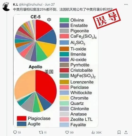但是,没有官方信息显示法国发布了网络爆炸中美对比数据。事实上,这个数据对比饼状图和“不到25%”的说法已经在2022年由科普博主李雷发布,他是中国科学院生物学博士。他在“为什么中国和美国的月份差别很大?”这篇个人帖子引用了国际学术论文及相关照片,表示:“用一种说法来说,中美月壤成分的相似性不到25%。我解释说,中美采集月壤的区域不同,我们采集的月壤更年轻。另外,原帖强调“这里没有怀疑美国月壤造假或给我国假月壤”。