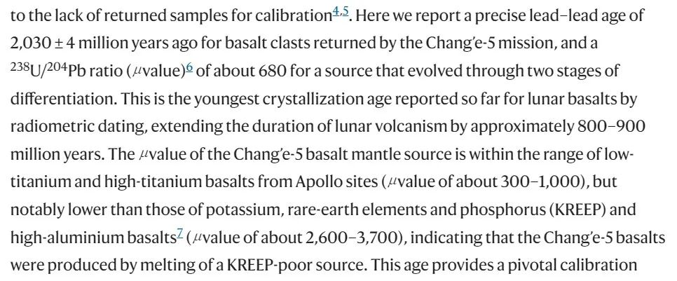 嫦娥五号月球样品地质定年推迟了约8亿年的月球火山活动结束时间。与阿波罗样品相比,嫦娥五号月球样品的物理参数与主要颗粒相似,但矿物和化学成分确实不同。