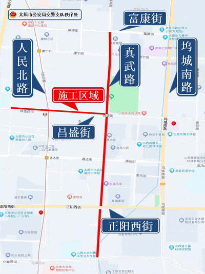昌盛街汾东南路至真武路段半封闭施工,半件物品双向通行。其中: