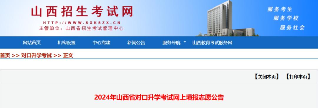山西省招生中心近日发布公告。2024年,7月6日8:00至7月10日18:00在我省对口入学考试网上填报志愿。考生可登录山西省招生考试网,填报第一批普通本科院校、第二批民办本科院校、高职院校志愿,逾期不予填报。