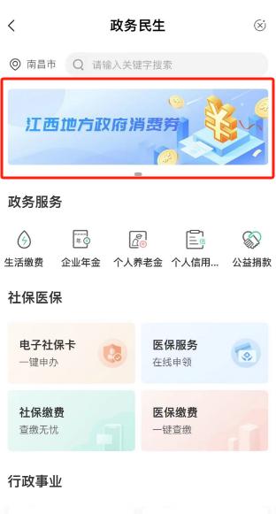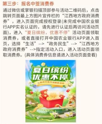 3.微信扫描活动二维码进入中国农业银行掌上银行“政府民生”页面,或直接进入中国农业银行掌上银行APP“生活”-“政府民生”,点击“江西当地政府优惠券”-“夏季丰富多彩,优惠不断!”进入活动页面,先报名参加中奖券活动。