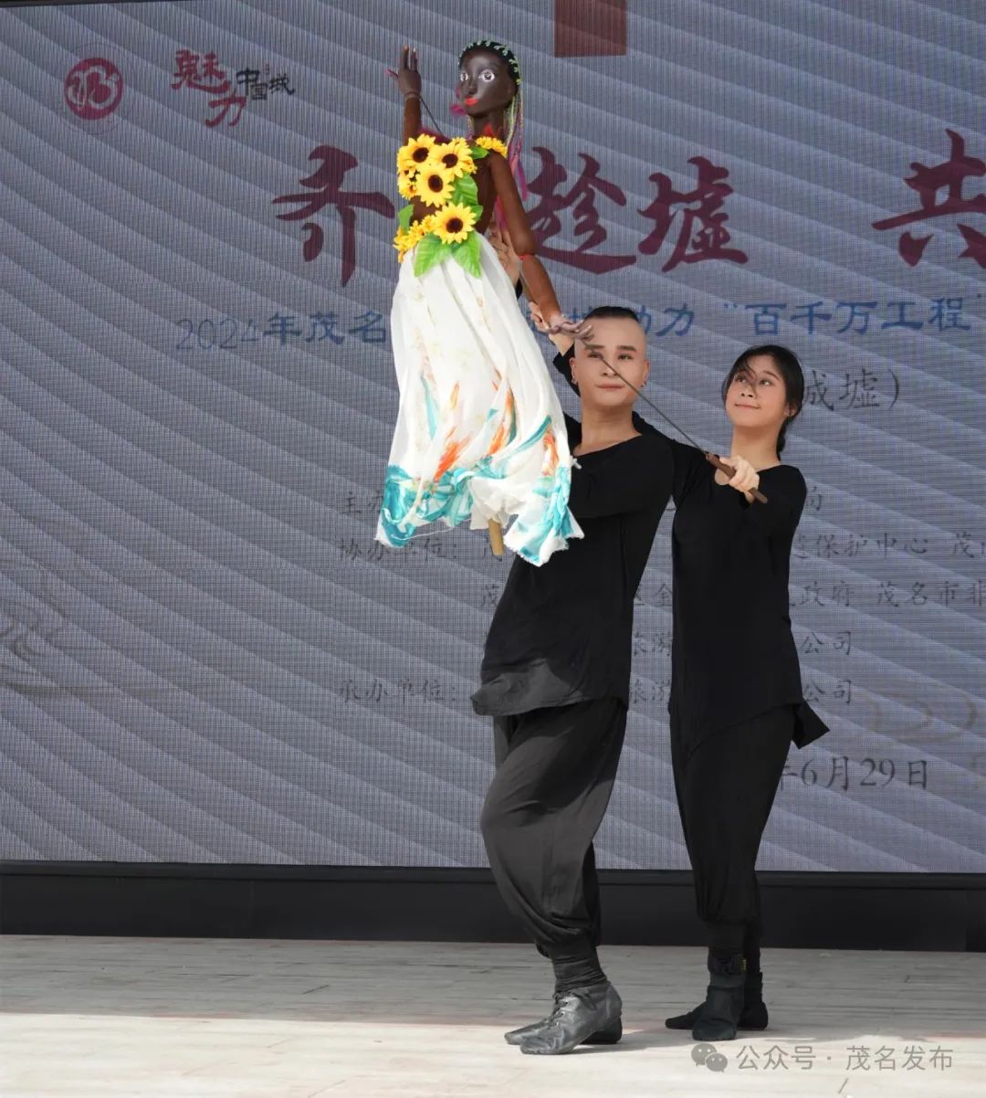 彩带飘飘,“反派”活灵活现。传统的高州木偶戏引起了燃油城市废墟舞台的热情。娃娃有时在空中旋转飞翔,有时长袖半遮住脸,都栩栩如生。当传统与现代相结合时,会产生怎样的火花?穿着现代长裙的娃娃在两位艺术家的操作下翩翩起舞。两人动作统一,配合动感音乐,娃娃张开双臂,跳跃,旋转...迎接观众的掌声。
