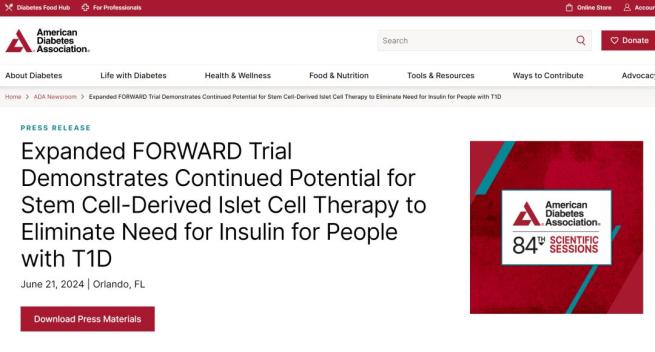 △VX-美国糖尿病协会研究的880胰岛细胞疗法1/2期FORWARD临床研究新数据®(ADA)第84届科学会议研讨会公布