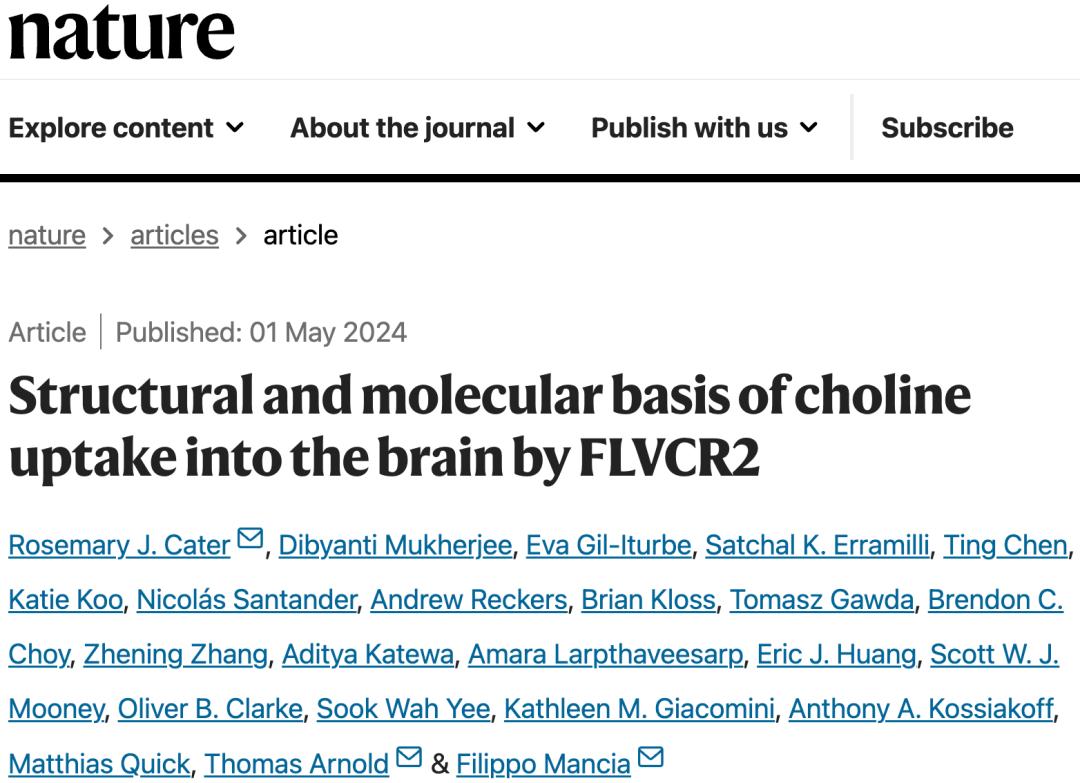 [1].Cater RJ, Mukherjee D, Gil-Iturbe E, et al. Structural and molecular basis of choline uptake into the brain by FLVCR2. Nature. 2024;629(8012):704-709. doi:10.1038/s41586-024-07326-y
