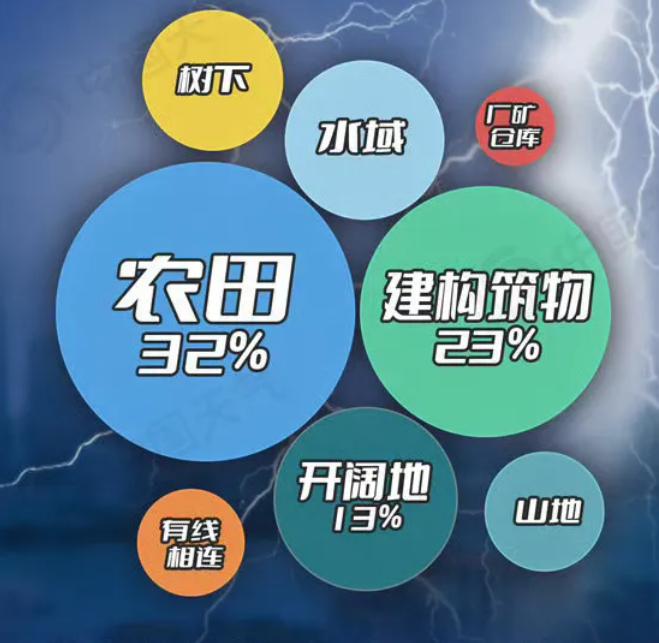 资料表明,在我国发生的雷击事故中,田地是最常见的地方,此外,建筑物、开放地也是比较容易发生雷击的地方。