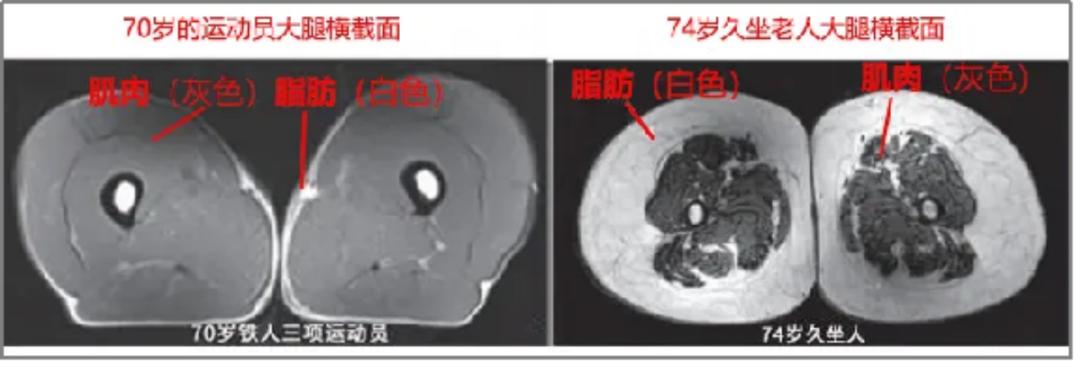 两张照片分别是70岁铁人的大腿肌肉横断扫描图和74岁久坐老人的大腿肌肉横断扫描图。可以看出,坚持锻炼的人大腿肌肉含量明显更高,皮下脂肪更少;与久坐的人相比,大腿肌肉含量明显下降,皮下脂肪更多。③
