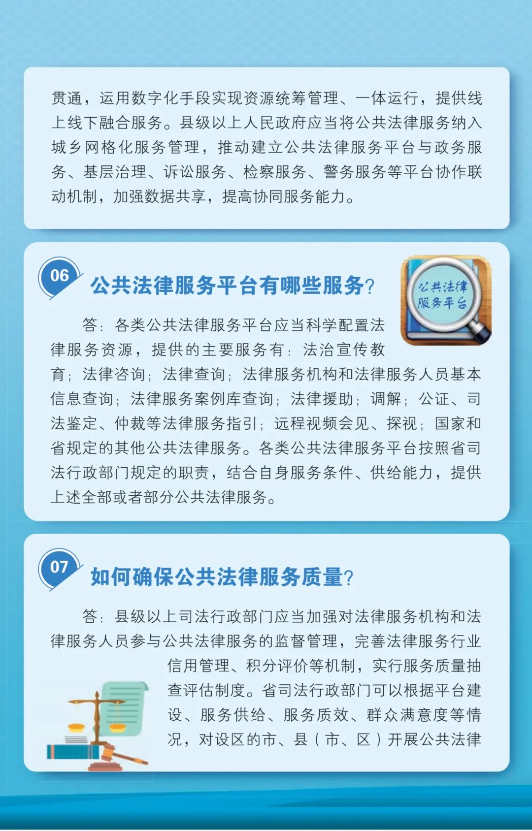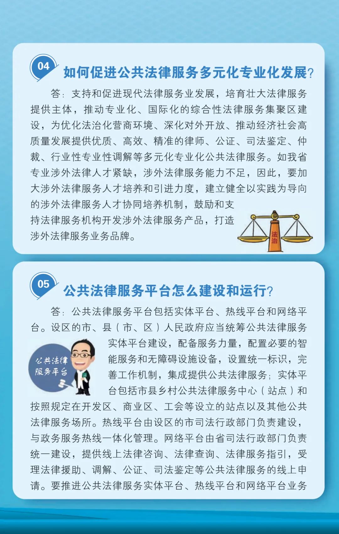 《条例》主要从基本公共法律服务、多元化系统化公共法律服务、公共法律服务平台、保障和监督等方面作出规定。