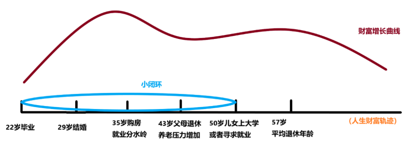如果切割财富阶段,22岁毕业是原点,我国初婚平均年龄为29岁(28.67岁),正好是7年财富变化的周期;而35-36岁,正处于刚需买房的平均年龄,也是所谓的中年就业瓶颈;在2个7年周期后的50岁阶段,孩子们面临着新一轮的大学就业周期,从此形成了第一个闭环;57岁是中国实际平均退休年龄,财富增长与储蓄的关系再次发生变化,形成一个大闭环。