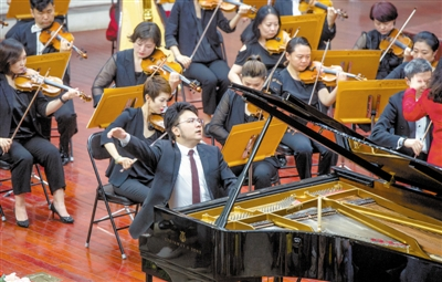 图为张乐弹奏钢琴协奏曲《黄河》。