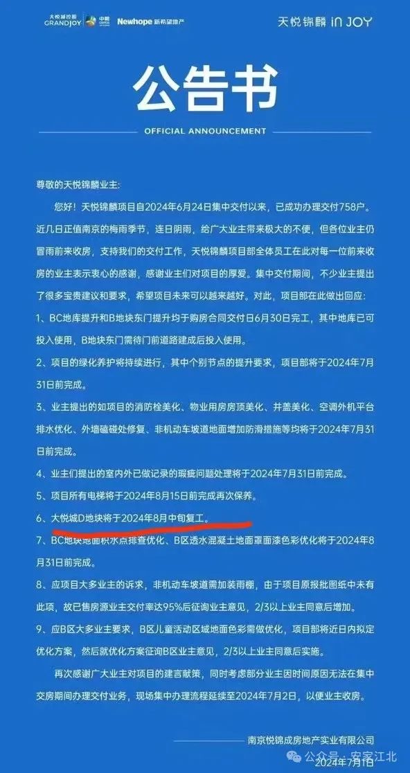 就在昨天,南京悦锦成房地产工业有限公司发布公告,主要内容是回复天悦锦麟在此期间的交付中业主的要求。