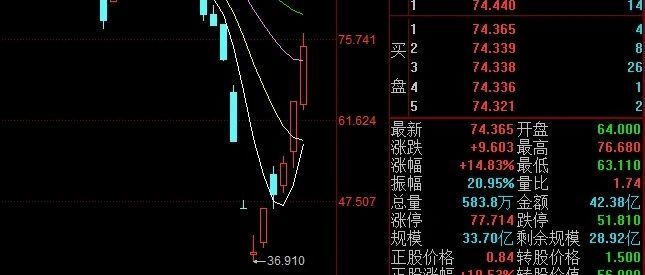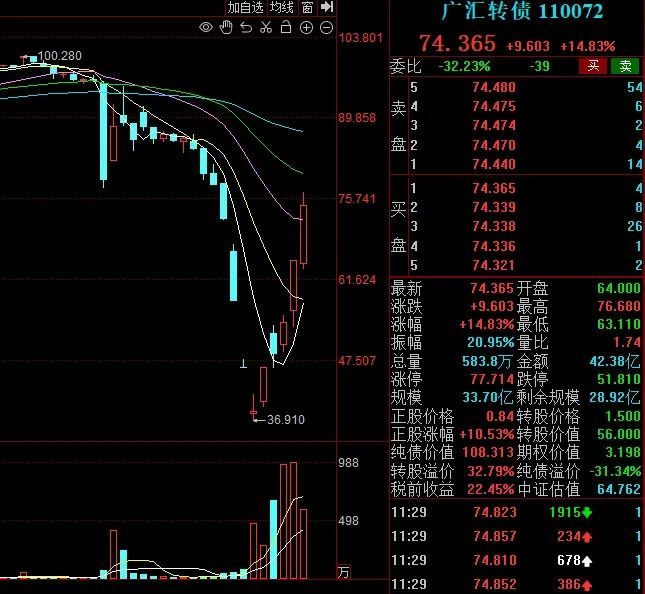 最近,广汇转债走出了一个大V,6月25日是一个转折点,当天触及36.91元的低点,此前持续暴跌,数次下跌20%,此后绝地旋转,今天早晨收盘上涨14.83%,价格为74.365元,5个交易日翻了一番。