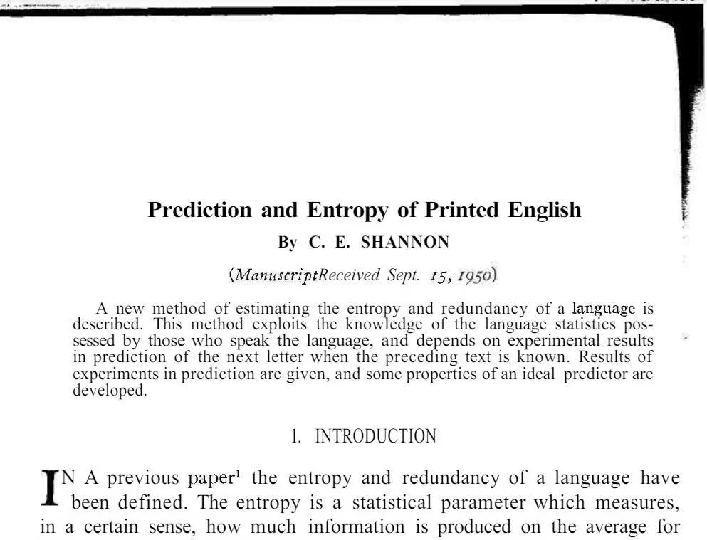 讨论中提到的 IT 祖先克劳德・香农论文是这样的《Prediction and Entropy of Printed English》。