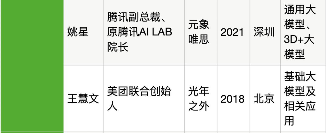 如图所示,美团至少有三位大厂高管加入了生成式AI创业,包括:美团创始人王慧文、原美团高级副总裁陈亮、原美团高级副总裁兼创始人杨俊。
