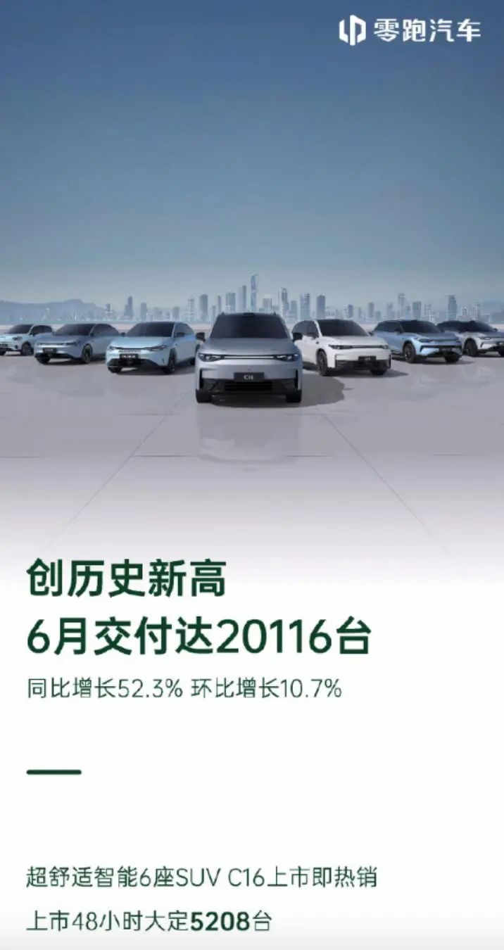 七月一日,零跑汽车发布最新交付数据:2024年6月,零跑汽车交付20116辆,首次进入“2万俱乐部”、创历史新高,上半年零跑汽车累计交付量达到86696辆。