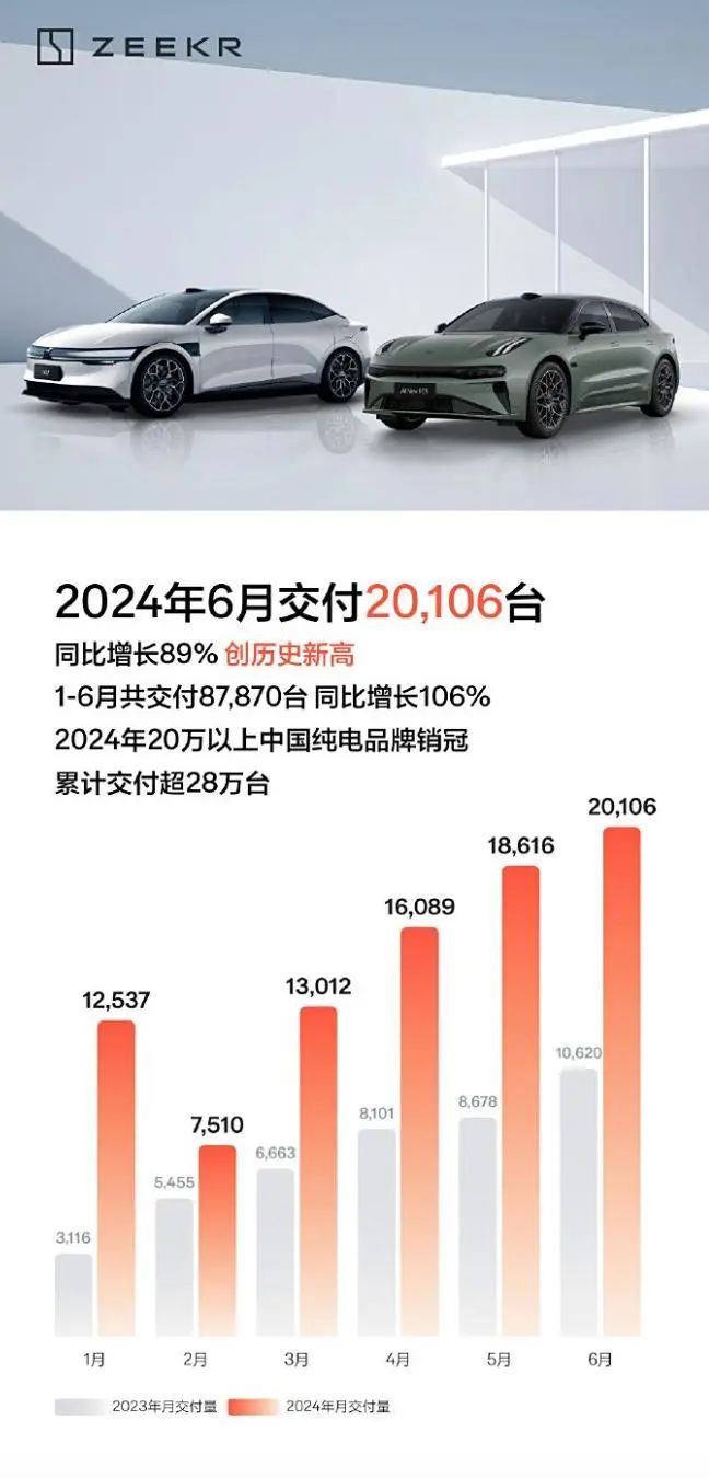 7月1日,极氪智能技术宣布最新交付量,2024年6月交付20106辆,同比增长89%,环比增长8%,创历史新高。据悉,这也是极氪品牌首次单月交付超过2万辆。今年1-6月,极氪共交付87870辆,同比增长106%。