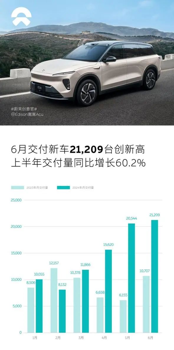 7月1日,蔚来宣布6月份新车交付21,209辆,同比增长98%,创历史新高;2024年第二季度,蔚来新车交付57,373辆,同比增长143.9%。2024年上半年,蔚来新车交付87,426辆,同比增长60.2%