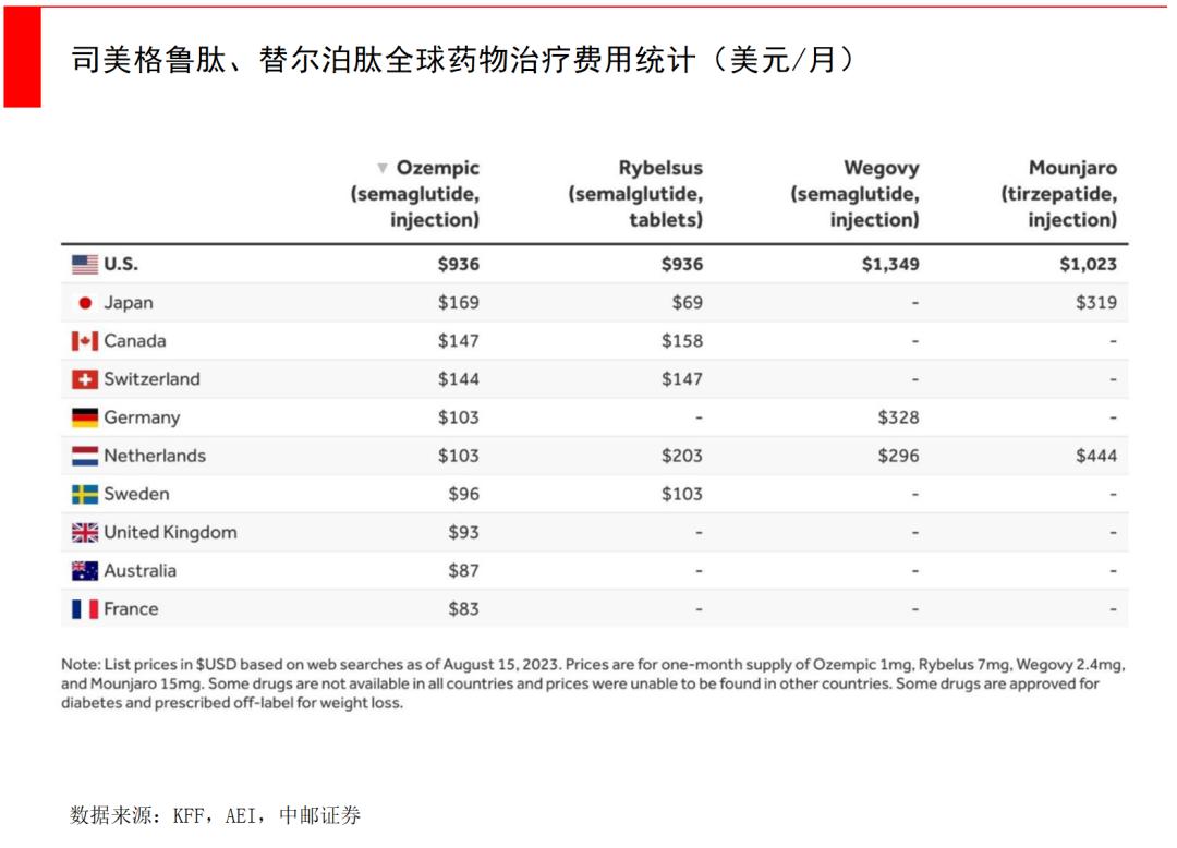 例如,司美格鲁肽(降糖药Ozempic)和口服司美格鲁肽,根据KFF对司美格鲁肽和替尔泊肽的治疗费用,每月按疗程注入并维持。(Rybelsus)每月936美元,司美格鲁肽(减肥药Wegovy)每月1349美元,替尔泊肽(减肥药Wegovy)(Mounjaro)每月定价1023美元,在美国,两种药物(4种制剂)的价格明显高于其他国家,价格差异约为5~10倍。