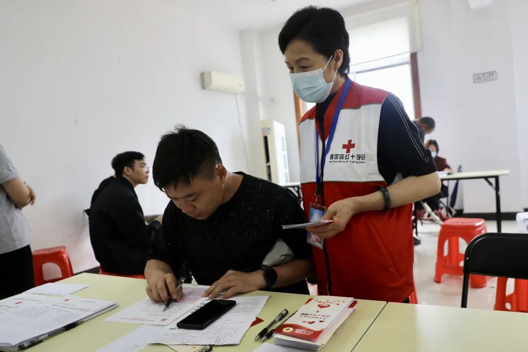 他说:“我今天和爱人一起来,我们已经连续献血五六年了。考虑到我们现在的身心健康,平时也经常做运动,在条件允许的情况下,多做贡献。”来自博泰社区的居民周伟强告诉小嘉,他每年都要带着家人一起献血,有一次还带着自己家和亲戚家的孩子。他说:“那时候他们刚满18岁,学校放暑假就一起来了。但愿他们能以自己的热情肩负起新时代青年的责任与担当,为社会贡献一份爱和力量。”周伟强说。