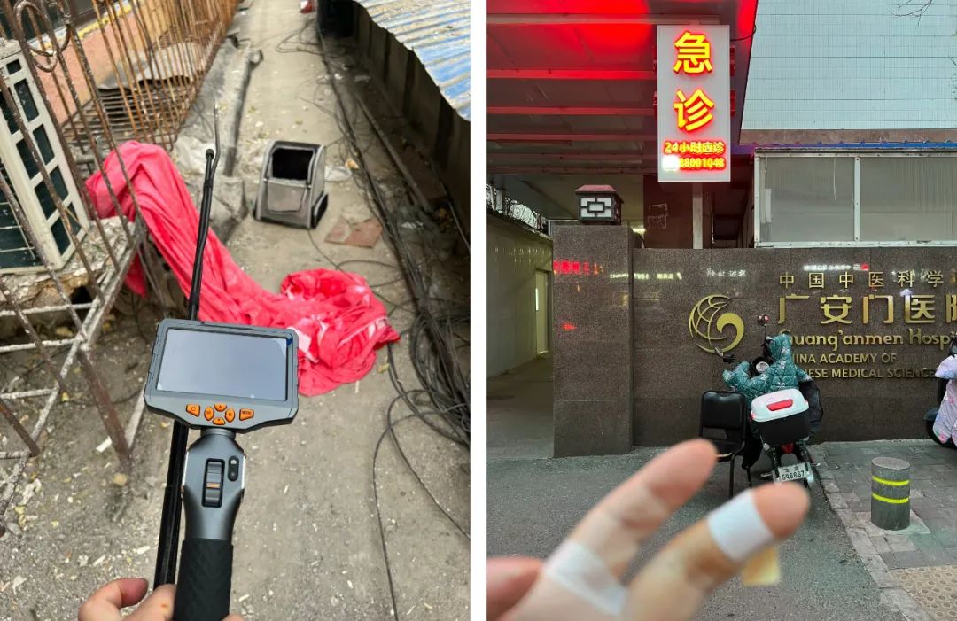 左:寻找宠物探测器,右:陈营被发现的小猫咬伤到处都是伤口,一根手指几乎被咬伤。他连夜跑了三家医院才接种疫苗。