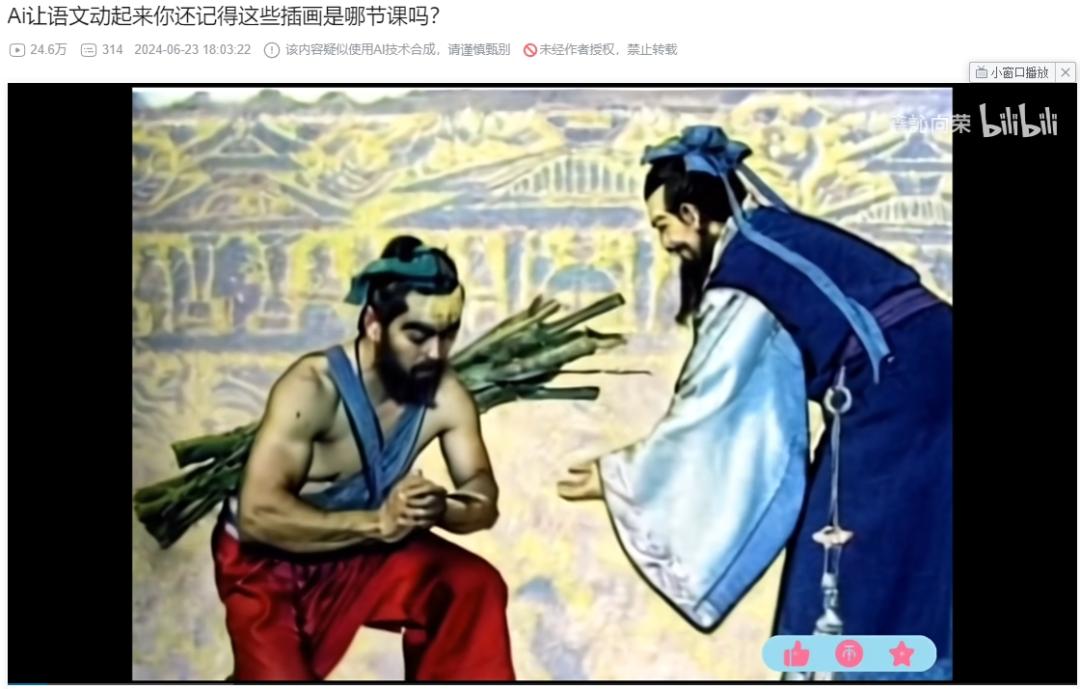 哔哩哔哩UP大师“新向荣”瞄准了国内很多用户熟悉的语文教材,让教材中的插图动起来,零粉起步24.6万播放。