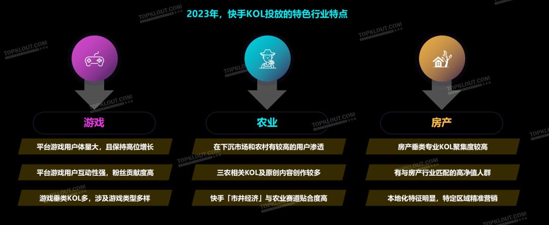 快手典型投放行业覆盖面广,互联网类行业是主要投放选择。 游戏、农业、房地产成为快手平台广告商KOL投放特色产业。