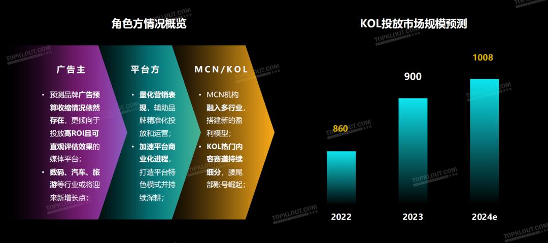 总的来说,在股票中玩游戏是2023年广告主推出KOL的主旋律。根据克劳锐的数据,KOL在2023年的市场投资规模约为900亿元,增长率约为4.7%。市场增长是网络广告市场的温暖和升温,主要是搜索广告、信息流和电子商务广告,是推动万亿网络广告市场增长的中坚力量。