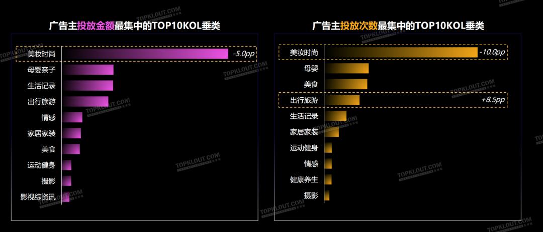 在过去的一年里,终端KOL的增长速度最快。与去年相比,投放频率同比增长9.8%,投放额度同比仅增长3.3%。较小的额度增长有利于广告商打造性价比高的跨平台、跨垂式终端KOL矩阵,帮助实现营销目标。