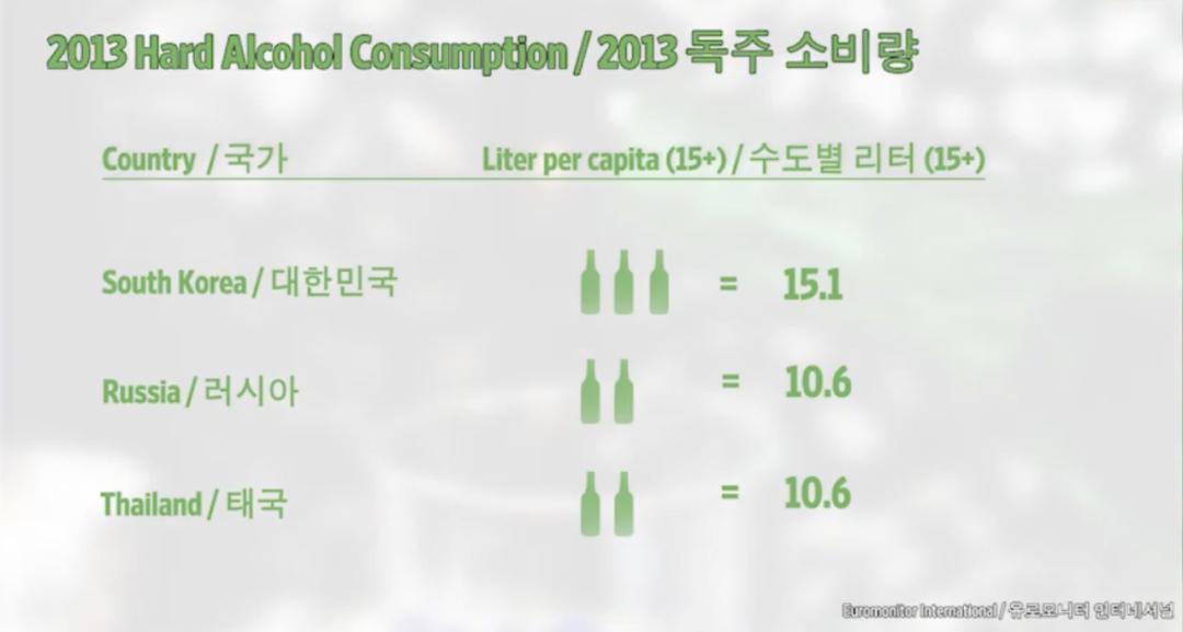 根据世卫组织2014年的数据,韩国人均乙醇消费位居世界第十三位,是亚洲最受欢迎的国家。