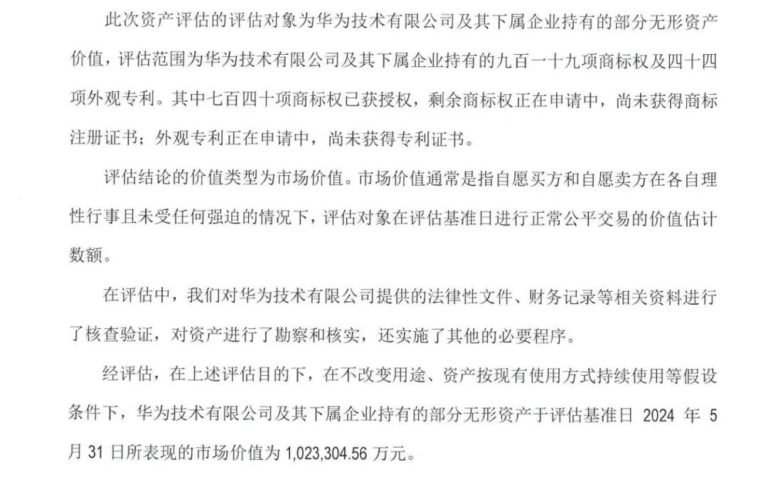 受赛力斯委托,中京民信(北京)资产评估有限公司于7月1日发布分析报告:华为技术有限公司及其下属公司在评估基准日2024年5月31日持有的部分无形资产,在不改变用途、按目前使用方式持续使用的情况下,市场价值为1023万元,304.56万元。