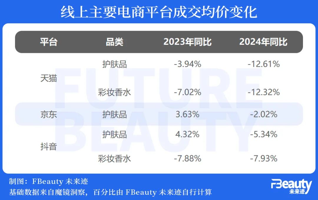 在全网最低价格、全平台比价等各种措施下,客户消费预期低迷叠加,美妆在线平均成交价格持续下跌。