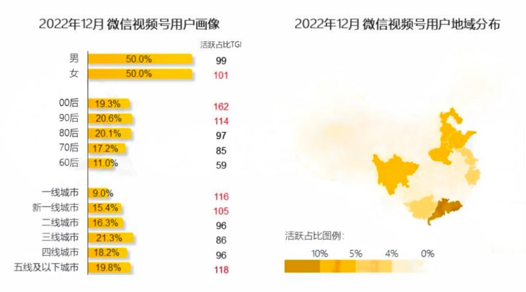 另外,从城市层面来看,大约59.3%的视频号客户居住在三线城市及以下,广东、四川、河北、山东、山西是活跃用户排名前五的省份。