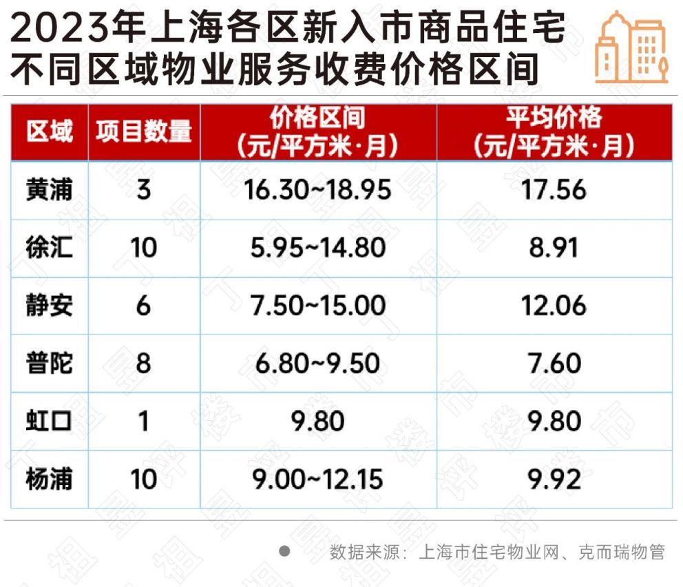 根据克而瑞的统计数据,2023年上海新入市项目,物业费平均每月7.46元,中位数6.73元/平方米,与2015年前上海统一参考价相比,“最高不超过2.3元/平方米/月”已翻了一番。
