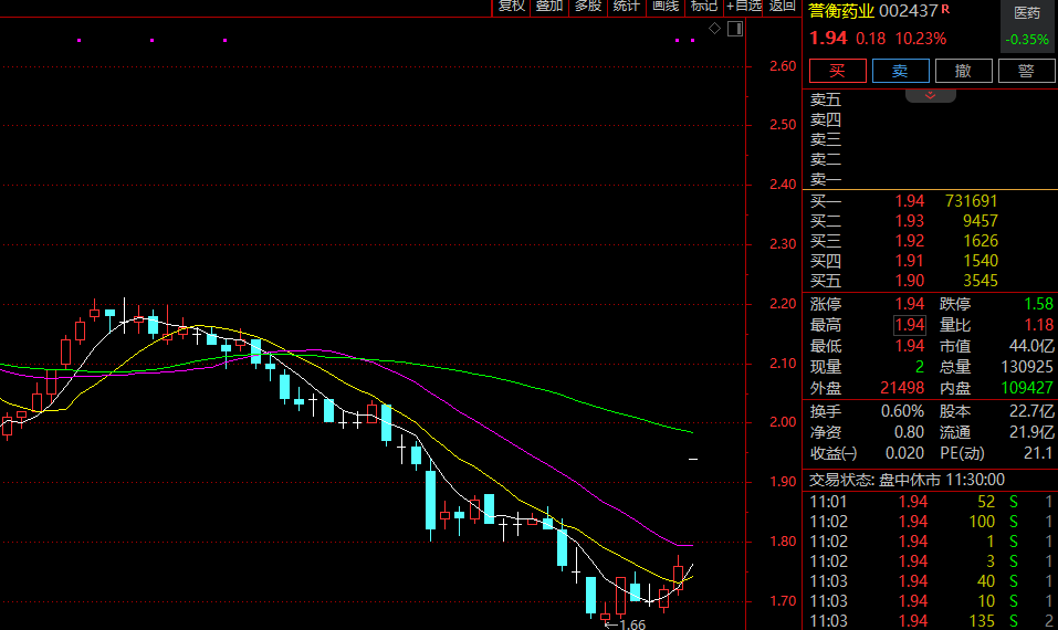 今天宣布,誉衡药业预计上半年净利润将达到1亿-1.3亿元,比去年同期增长253.99%-360.19%。受此消息影响,早间,誉衡药业开盘一字涨停。