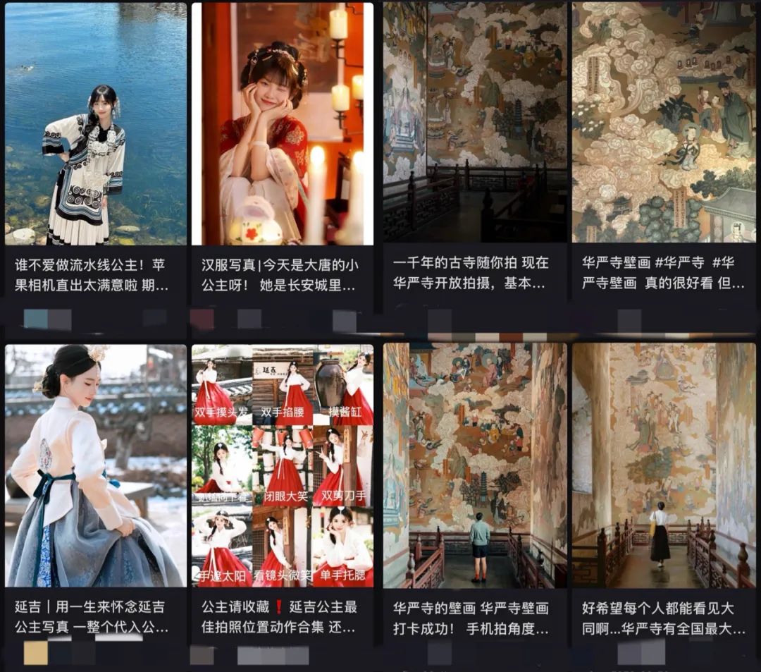 此外,由于车站内用户分享氛围浓厚,小红书的“打卡效应”也非常明显。比如2023年,小红书用户分享的山西华严寺普光明殿壁画的拍照策略,迅速引起了车站内用户对山西华严寺的兴趣。大量客户去拍照打卡点,和千年壁画合影。