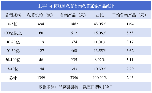 上半年备案商品的近一半来自于不同规模的小规模私募。私募股权排网数据显示,上半年共有1462个私募股权产品被记录在894家0-5亿元的私募股权中,占记录产品总数的43.05%。然而,大规模私募备案商品更加活跃。根据私募网络数据,上半年有512家100亿元以上的私募股权产品备案,每家私募股权机构均有近9家备案商品,远高于其他规模群体的私募股权平均备案水平。