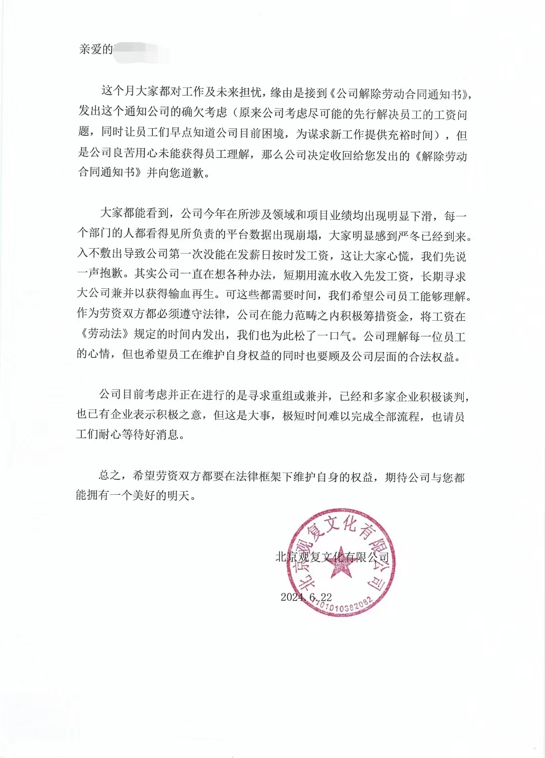 据张先生介绍,6月22日,公司收回了部分解除劳动合同的通知。他提供的一份北京观复的解释显示:“这个月大家都在担心自己的工作和未来,因为收到了《公司解除劳动合同通知书》,公司确实没有考虑这个通知(原来公司考虑尽量先处理员工的工资,同时让员工尽快了解公司目前的困境,为寻求新工作提供足够的时间),但公司却苦苦挣扎,没能得到员工的理解。然后公司决定收回给你的《解除劳动合同通知书》,并向你道歉。该通知还提到:公司今年在所涉及的领域和项目业绩均有明显下滑,公司目前正在考虑和进行寻找重组或合并。该通知还提到,公司今年在所涉及的领域和项目中的业绩明显下滑,目前正在寻找重组或合并。通知的签名时间是2024年6月22日。
