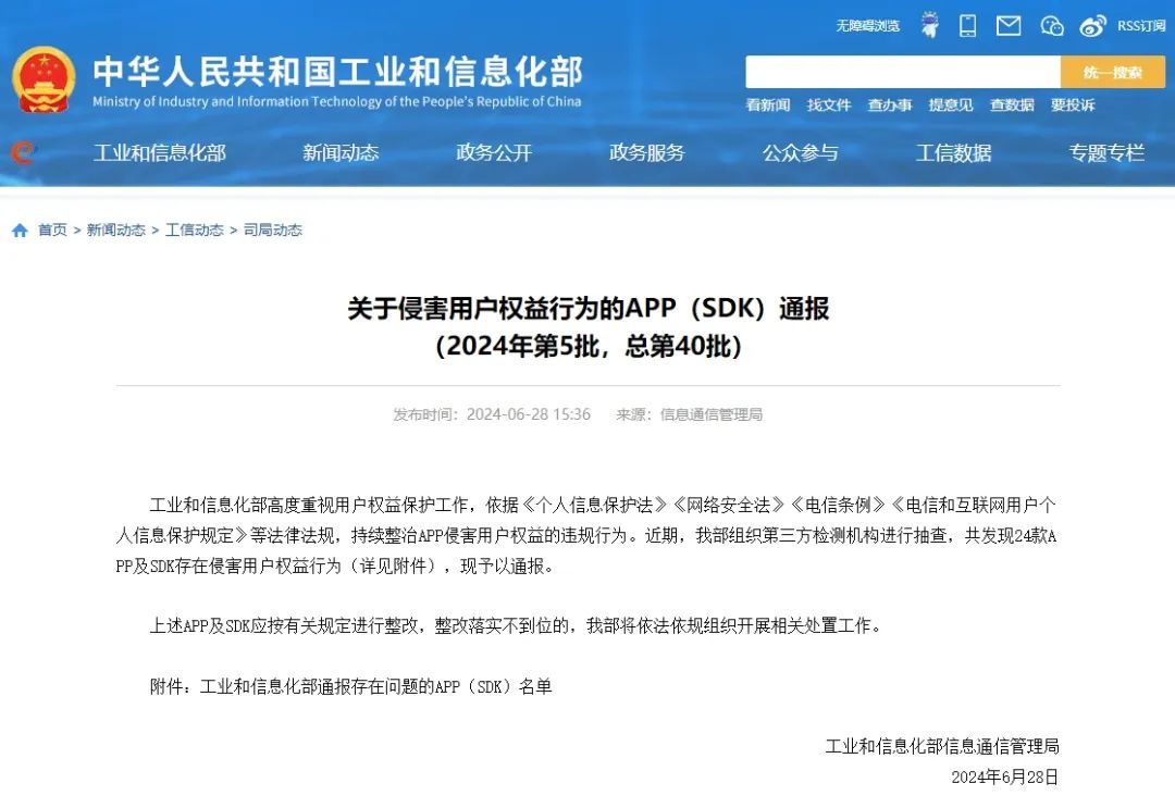工业和信息化部网站28日通报,近日,工业和信息化部组织第三方检测机构进行抽查,共发现24款APP和SDK存在损害用户权益的行为。