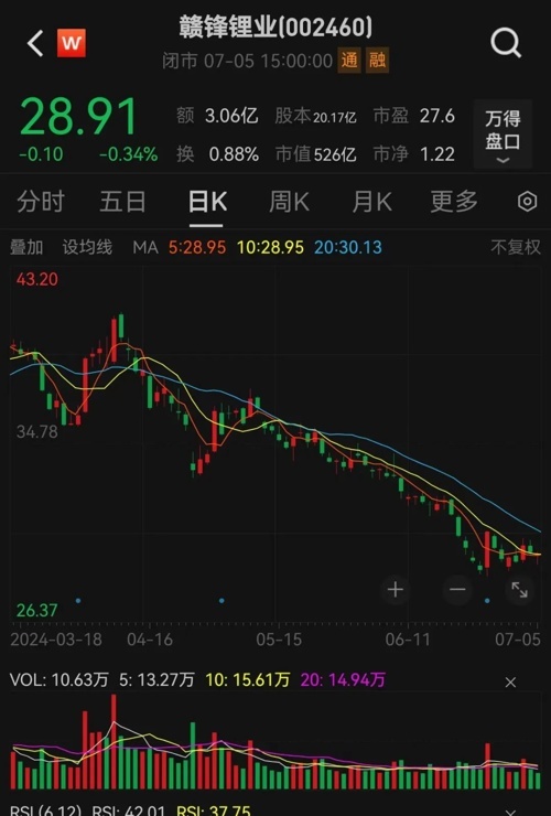 赣锋锂业最新市值为526亿元,截至7月5日,其股价为28.91元。