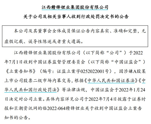 7月5日晚,赣锋锂业发布公告,披露中国证监会江西监管局发布的《行政处罚决定书》。赣锋锂业除了被没收违法所得外,还将对公司涉嫌内线交易*ST江特股票处以罚款。而且赣锋锂业董事长李良彬及时任董事长欧阳明都被警告并罚款。