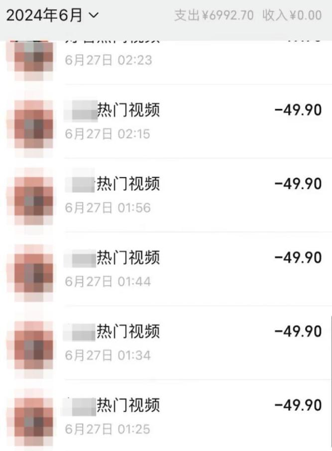 六月二十七日凌晨1点25分,她向“XX热点视频”支付了49.9元,然后每隔10分钟支付一次;