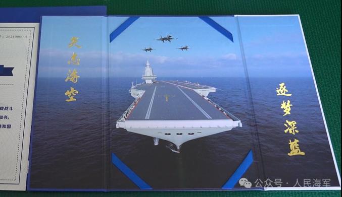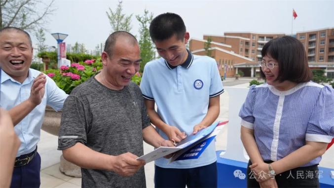 ▲海军招聘办公室工作人员向尹子涵发出录取通知书。