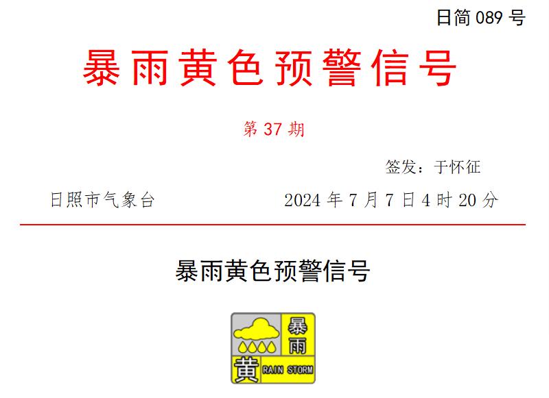 2024年7月7日4时20分,日照市气象台发布了东港区和岚山区暴雨黄色预警信号:目前岚山区碑廓镇和岚北港6小时降水接近50毫米。预计东港区和岚山区管辖的乡镇(街道)的降水将在今天白天至明天持续,可能伴随着8。~10级雷雨大风,最大降水量为1小时40。~60mm。注意预防。