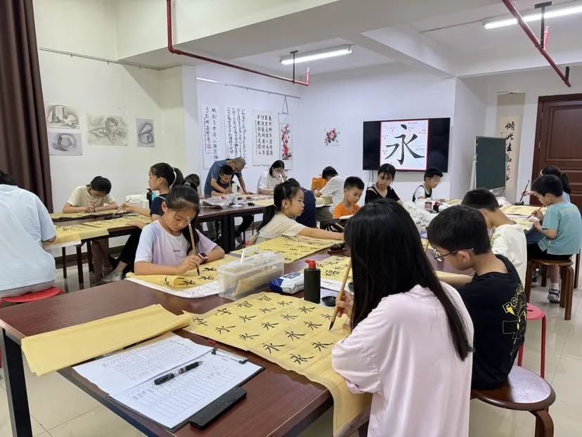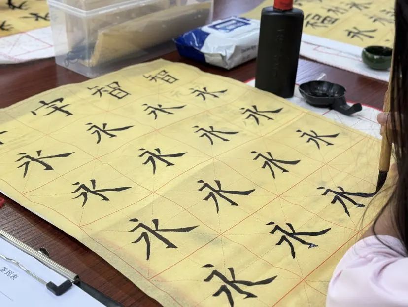 一群孩子围坐在古色古香的木桌旁,手持软笔,聚精会神地练习书法,在书法活动室里。社区书法大咖吴老师让孩子们训练的第一个字就是永恒的“永”字。“永”字在书法中被称为“永字八法”,因为它包含了书法中绝大多数的基本笔画,如点、横、竖、撇、憋、提、折、钩等。对零基础的学习者来说,从“永”字开始,能迅速掌握书法的基本技巧,了解书法的构造美和节奏美。