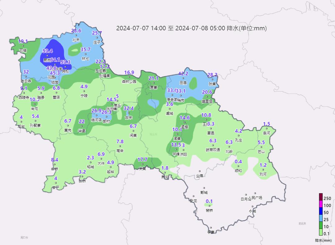7月7日14:00至8日05:00,我市发生阵雨、雷暴、危阳区和虞城北部暴雨、民权暴雨,全市平均降水量为11.6。mm,降雨量大于50毫米的网站有4个,25到50毫米的网站有22个,民权实验中学64.1mm,民权野岗最大一小时降雨量47.6mm。
