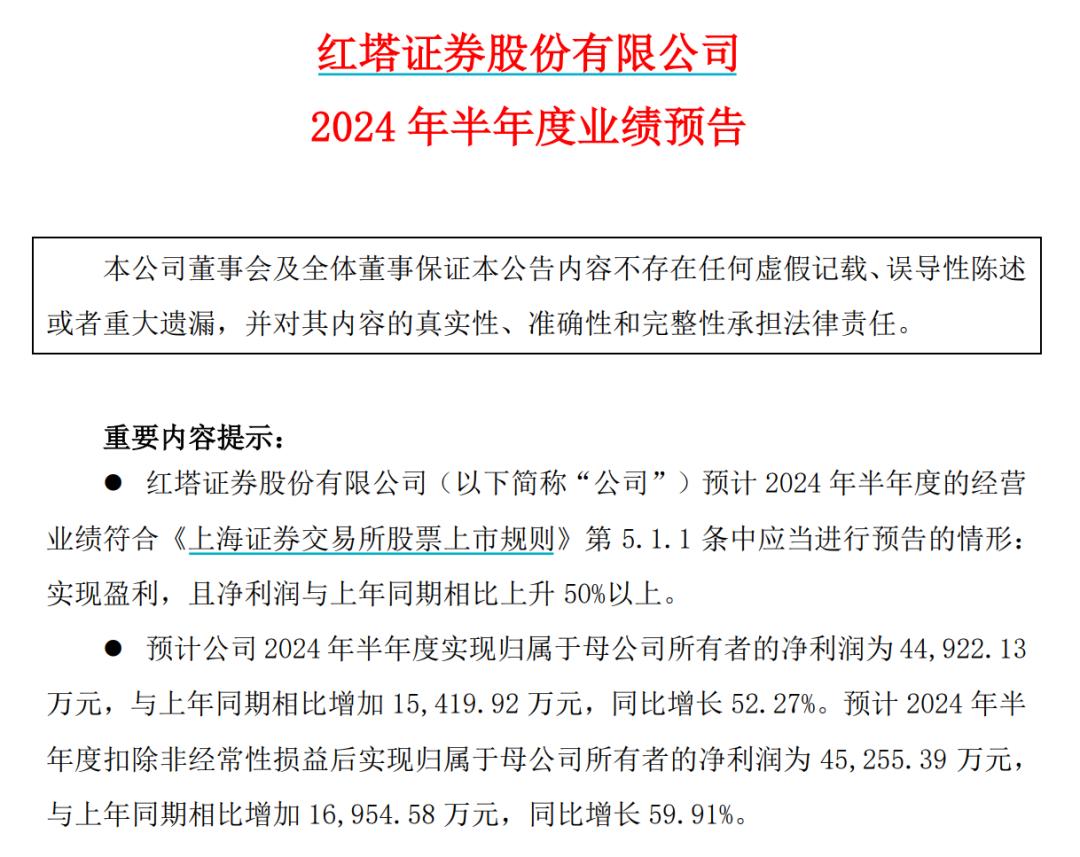 红塔证券预计,2024年上半年将实现归母净利润约4.49亿元,同比增长52.27%。