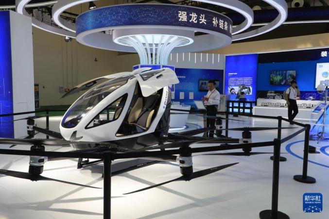 七月六日,在第三十届兰洽会主展厅,参与者参观了电动载人自动驾驶飞机。