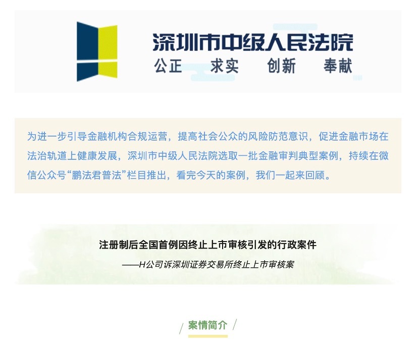 深圳市中级人民法院表示,H公司声称,深圳证券交易所创业板上市委员会对“发行人未能充分准确披露1400万元供应商向经销商的贷款事项,证明其合理性,相关内部控制制度未能有效实施”的观点与事实不符。此外,供应商贷款发生在三年报告期之外。因此,请求取消深圳证券交易所作出的《关于停止对H公司首次公开发行股票并在创业板上市审批的决定》,命令深圳证券交易所对H公司进行发行和上市审核。