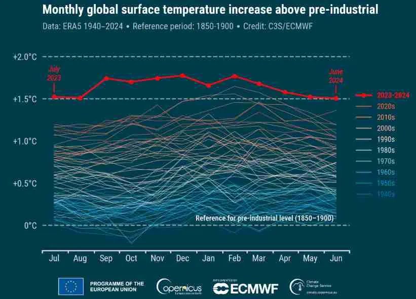 哥白尼气候变化服务局主任卡洛·布翁滕波表示,截至6月,全球气温已连续13个月达到新高,且连续12个月高于工业化前1.5℃,“这凸显了气候的巨大而持续的变化”。